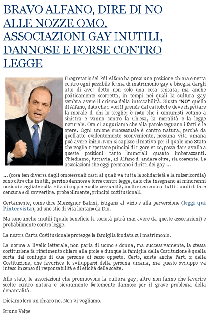 Data la linea omofoba e spesso integralista del sito "cattolico" Pontifex, non so quanto possa far piacere ricevere il suo plauso. Fatto sta che le affermazioni di Angelino Alfano, il segretario del Pdl, hanno risvegliato l'interesse del suo direttore, Bruno Volpe. Sotto attacco -tanto per cambiare- i gay a cui Alfano promette battaglia per non consentire il riconoscimento delle coppie di fatto o di matrimoni fra persone dello stesso sesso.