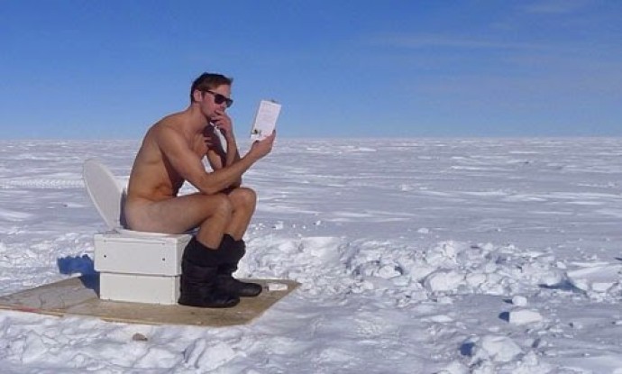 Il contesto è quantomai curioso: l'attore svedese è seduto nudo su un water nel bel mezzo dell'Antartide, mentre la didascalia precisa che ci sono -30° e si domanda: «Cosa stai leggendo Alex? La sceneggiatura della settima stagione di "True Blood"?».
