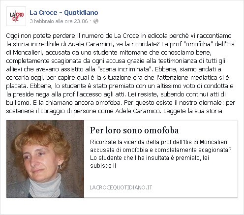 Peccato che già di per sé è difficile non rimanere scioccati nell'osservare la fotografia di un minorenne sbattuta lì solo per far pubblicità al proprio giornale. Non a caso, perlomeno sul piano del maeketing, Adinolfi appare sempre molto attento a cogliere qualunque occasione per vedere uno dei suoi prodotti: i suoi circoli omofobi sono una pubblicità gratuita al suo pessimo libro, il suo intervento al convegno lombardo è stata occasione per chiedere l'acquisto del suo orrendo giornale e, come vediamo ora, i bambini sono vittime sacrificabili all'ideologia per una qualche forma di autopromozione.