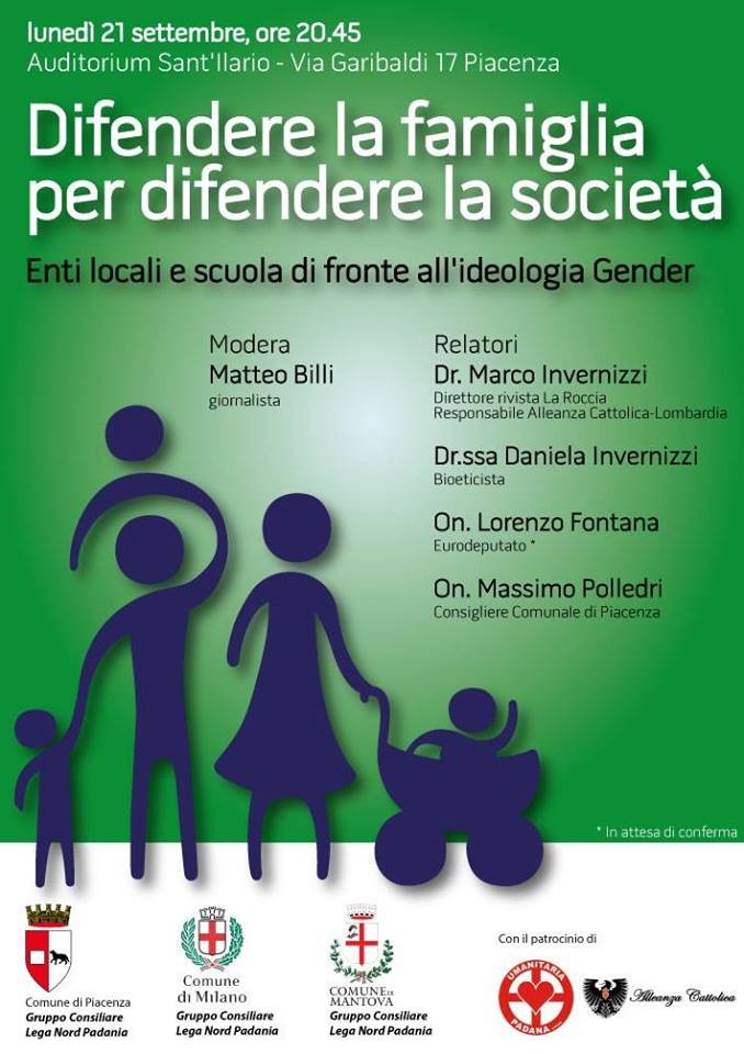 È notizia di queste ore che lunedì 21 settembre alle 21, si terrà nello spazio comunale dell'auditorium S.Ilario a Piacenza un convegno contro la inesistente "teoria del gender". Organizzato dal consigliere comunale piacentino della Lega Massimo Polledri (in foto) con i soldi di Alleanza Cattolica, il convegno ha utilizzato illegalmente i loghi dei comuni di Piacenza, Milano e Mantova. Nessun presidente dei rispettivi consigli comunali ha mai autorizzato l'utilizzo di tali loghi. Tralasciando l'aspetto che questo convegno illegale è ospitato da un spazio pagato dagli ignari cittadini di Piacenza, questo atto è l'ennesimo scempio che una falange politica commette nei confronti della società.