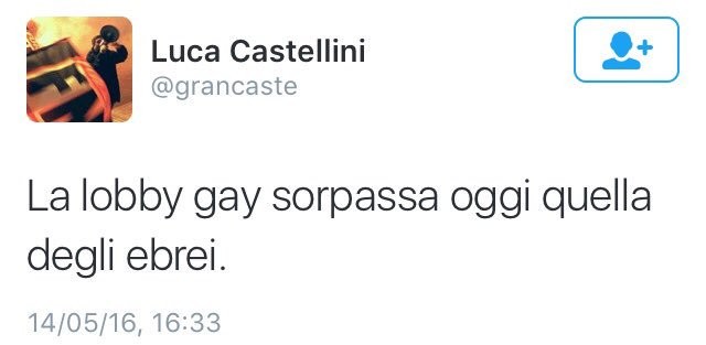 «La lobby gay sorpassa oggi quella degli ebrei». È questo il testo contenuto in un messaggio pubblicato in occasione dell'approvazione della legge sulle unioni civili su Twitter da Luca Castellini, dirigente nazionale di Forza Nuova e coordinatore per il Nord Italia. Non solo omofobia ma anche antisemitismo, dunque, in slogan che paiono farci ripiombare negli anni '30.