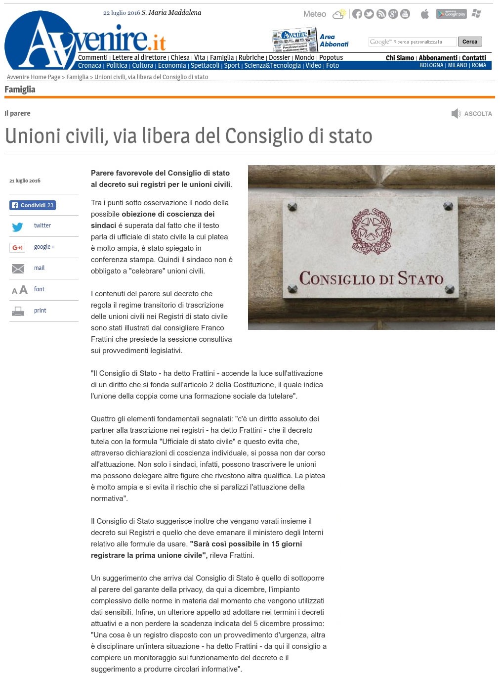 Il quotidiano dei vescovi rassicura i suoi lettori anche riguardo al fatto che le coppie gay verranno ritenute inferiori e meno meritevoli, sottolineando come Frattini li abbia assicurati sul fatto che «il Consiglio di Stato accende la luce sull'attivazione di un diritto che si fonda sull'articolo 2 della Costituzione, il quale indica l'unione della coppia come una formazione sociale da tutelare».