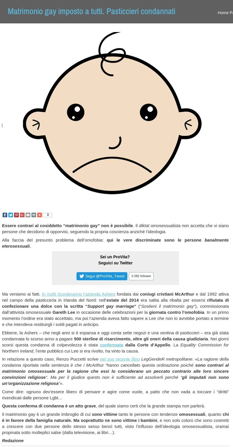 In un articolo intitolato "Matrimonio gay imposto a tutti. Pasticcieri condannati", l'organizzazione di estrema destra afferma: