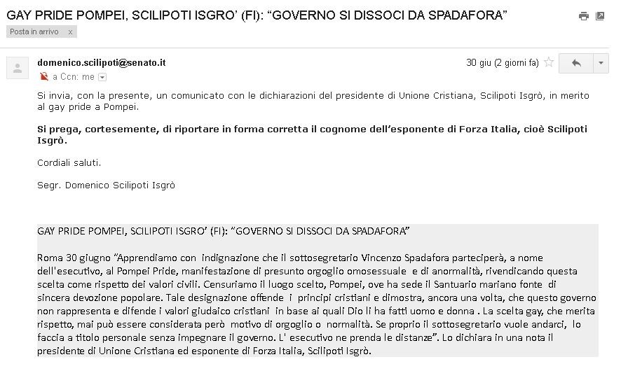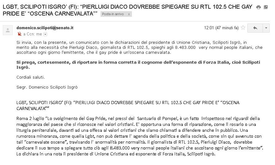 Lo svolgimento del Gay Pride, nei pressi del Santuario di Pompei, è un fatto irrispettoso nei riguardi della maggioranza del paese che si riconosce nei valori cristiani. E' opportuna una forma di riparazione, come il rosario o una liturgia penitenziale, davanti ad una offesa ai valori cristiani che siamo chiamati a difendere anche in pubblico. Una rumorosa minoranza, come quella Lgbt, non può dettare l' agenda della politica e della società, come sin qui avvenuto con tali “carnevalate oscene”, travisando l' anormalità per normalità. Il giornalista di RTL 102.5, Pierluigi Diaco, dovrebbe dedicare il suo tempo a spiegare tutto ciò agli 8.483.000 very normal people italiani che ascoltano ogni giorno l’emittente.