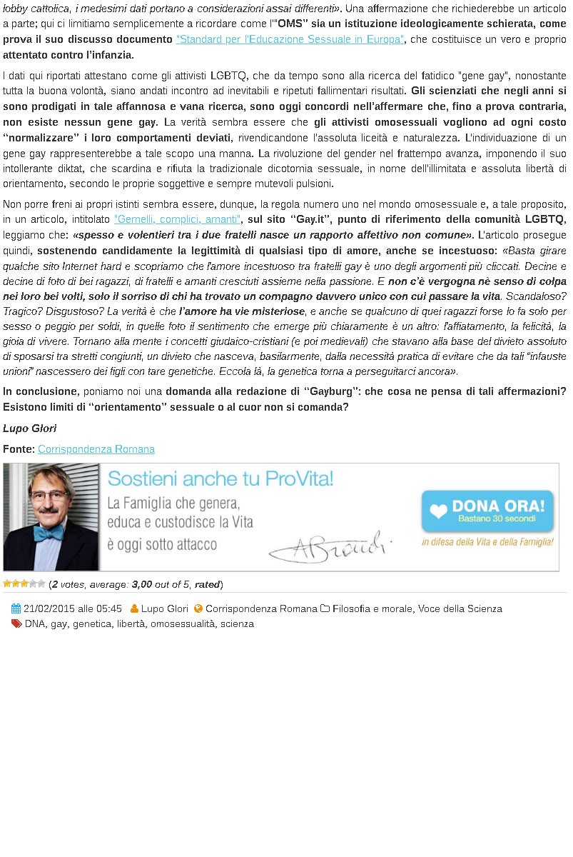 Non stupisce che un gruppo di promozione omofoba come quello dei forrzanovisti di Provita Onlus possa andare in giro a sostener che i gay debbano essere ritenuti "malati" e che la genetica direbbe che Pillon sarebbe superiore a loro in virtù di come non perda occasione per urlare in faccia ai suoi figli che lui si è scopato baraback la loro mamma. ma grave è come a pubblicare pubblicità su quelle pagine di disinformazione scientifica possa essere uno studio medico.