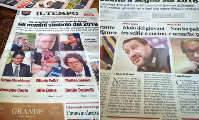Lo scorso anni Il Tempo elesse Benito Mussolini come il loro uomo dell'anno, quest'anno hanno preferito ripiegare su Salvini perché sarebbe «l'idolo dei giovani» in virtù dei suoi selfie e degli scatti che è solito pubblicare sui social per mostre al mondo qualunque schifezza si infili in bocca. Lodando lo scatto in cui il leghista mangia tutto soddisfatto una fetta di pan carré con la Nutella dopo che la mafia aveva appena ucciso un pentito affidato alla protezione del suo ministero e mentre migliaia di sfollati fuggivano dal terremoto, dicono che «Salvini piace perché è uno di noi». Eccerto, perché tutti noi abbiamo ricevuto 49 milioni di euro e ci è stato permesso di restituirli esentasse in un secolo.