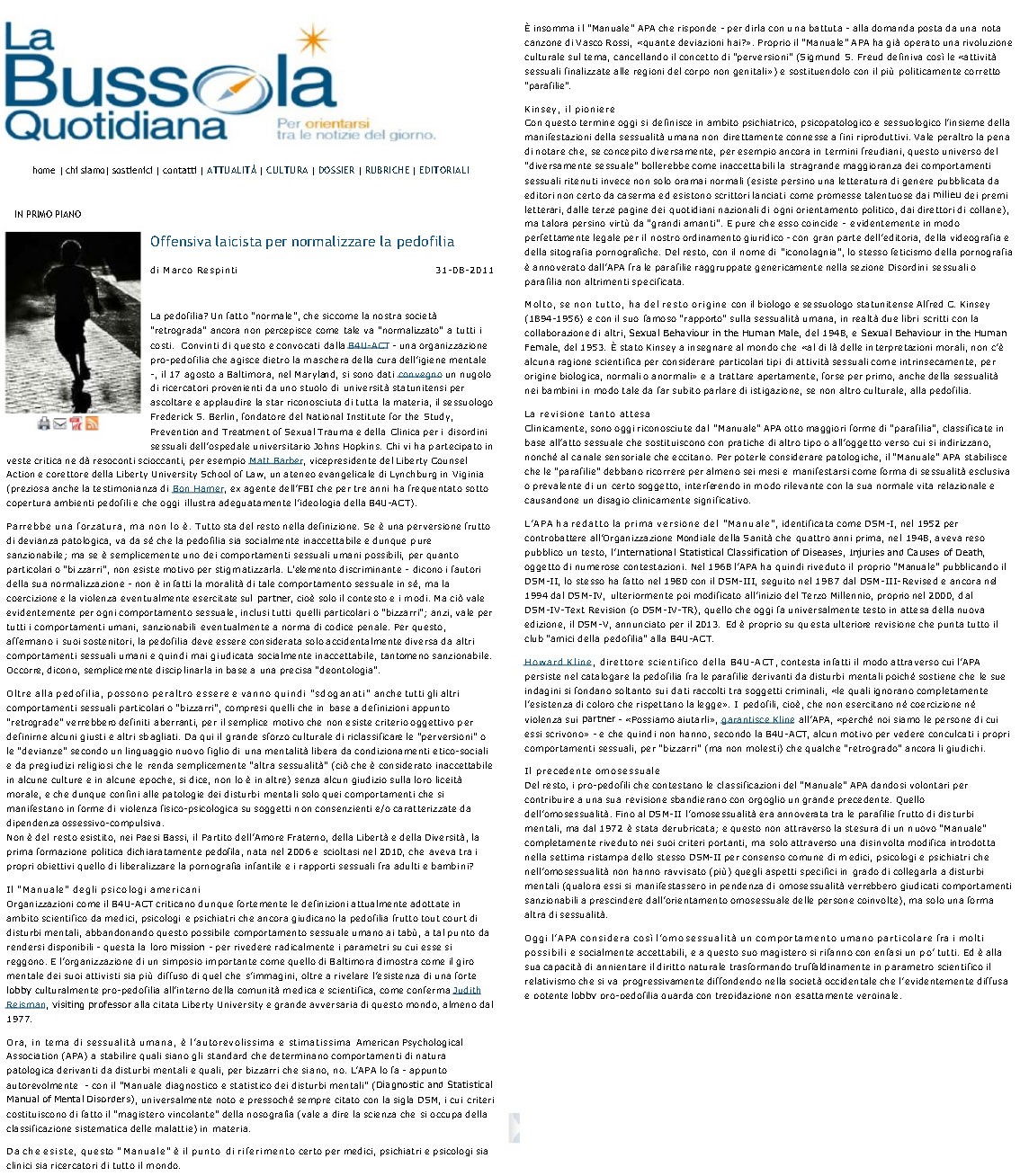 Oltre alla pedofilia, possono peraltro essere e vanno quindi "sdoganati" anche tutti gli altric omportamenti sessuali particolari o "bizzarri", compresi quelli che in base a definizioni appunto"retrograde" verrebbero definiti aberranti, per il semplice motivo che non esiste criterio oggettivo per definirne alcuni giusti e altri sbagliati. Da qui il grande sforzo culturale di riclassificare le "perversioni" o le "devianze" secondo un linguaggio nuovo figlio di una mentalità libera da condizionamenti etico-sociali e da pregiudizi religiosi che le renda semplicemente "altra sessualità" (ciò che è considerato inaccettabile in alcune culture e in alcune epoche, si dice, non lo è in altre) senza alcun giudizio sulla loro liceità morale, e che dunque confini alle patologie dei disturbi mentali solo quei comportamenti che si manifestano in forme di violenza fisico-psicologica su soggetti non consenzienti e/o caratterizzate da dipendenza ossessivo-compulsiva. [...] Del resto, i pro-pedofili che contestano le classificazioni del "Manuale" APA dandosi volontari per contribuire a una sua revisione sbandierano con orgoglio un grande precedente. Quello dell’omosessualità. Fino al DSM-II l’omosessualità era annoverata tra le parafilie frutto di disturbi mentali, ma dal 1972 è stata derubricata; e questo non attraverso la stesura di un nuovo "Manuale"completamente riveduto nei suoi criteri portanti, ma solo attraverso una disinvolta modifica introdotta nella settima ristampa dello stesso DSM-II per consenso comune di medici, psicologi e psichiatri che nell’omosessualità non hanno ravvisato (più) quegli aspetti specifici in grado di collegarla a disturbi mentali (qualora essi si manifestassero in pendenza di omosessualità verrebbero giudicati comportamenti sanzionabili a prescindere dall’orientamento omosessuale delle persone coinvolte), ma solo una forma altra di sessualità. Oggi l’APA considera così l’omosessualità un comportamento umano particolare fra i molti possibili e socialmente accettabili, e a questo suo magistero si rifanno con enfasi un po’ tutti. Ed è alla sua capacità di annientare il diritto naturale trasformando truffaldinamente in parametro scientifico il relativismo che si va progressivamente diffondendo nella società occidentale che l’evidentemente diffusa e potente lobby pro-pedofilia guarda con trepidazione non esattamente verginale.