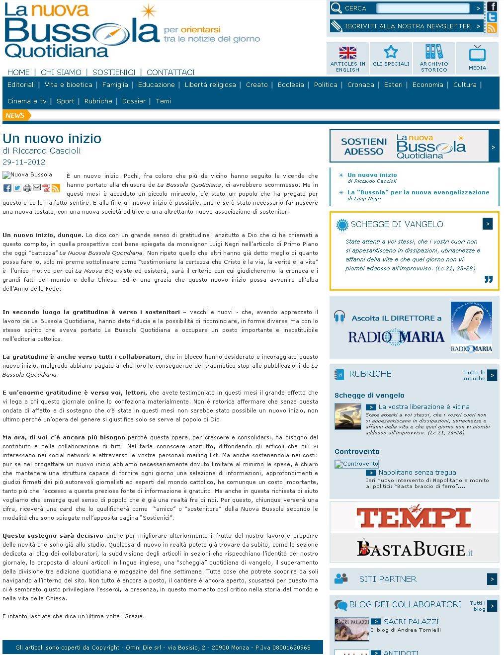 La partita IVA legata a quella pubblicazione risulta essere stata chiusa il 17 dicembre 2013, mentre è il 29 novembre 2012 che Cascioli annunciò la fondazione di una nuova testata denominata "La nuova Bussola Quotidiana" che avrebbe sostituito la precedente. Nel suo primo editoriale, sempre evitando di dare troppo spiegazioni, disse che era stato «necessario far nascere una nuova testata, con una nuova società editrice e una altrettanto nuova associazione di sostenitori».
