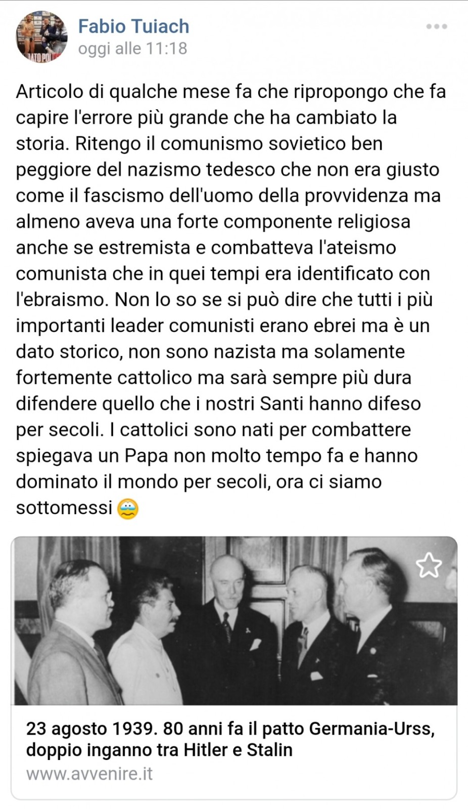 E dato che l'Italia dovrebbe essere antifascista, perché Tuiach non viene indagato mentre inneggia al fascismo e all'antisemitismo sostenendo che sarebbero espressioni del suo definirsi opinabilmente "cristiano"?