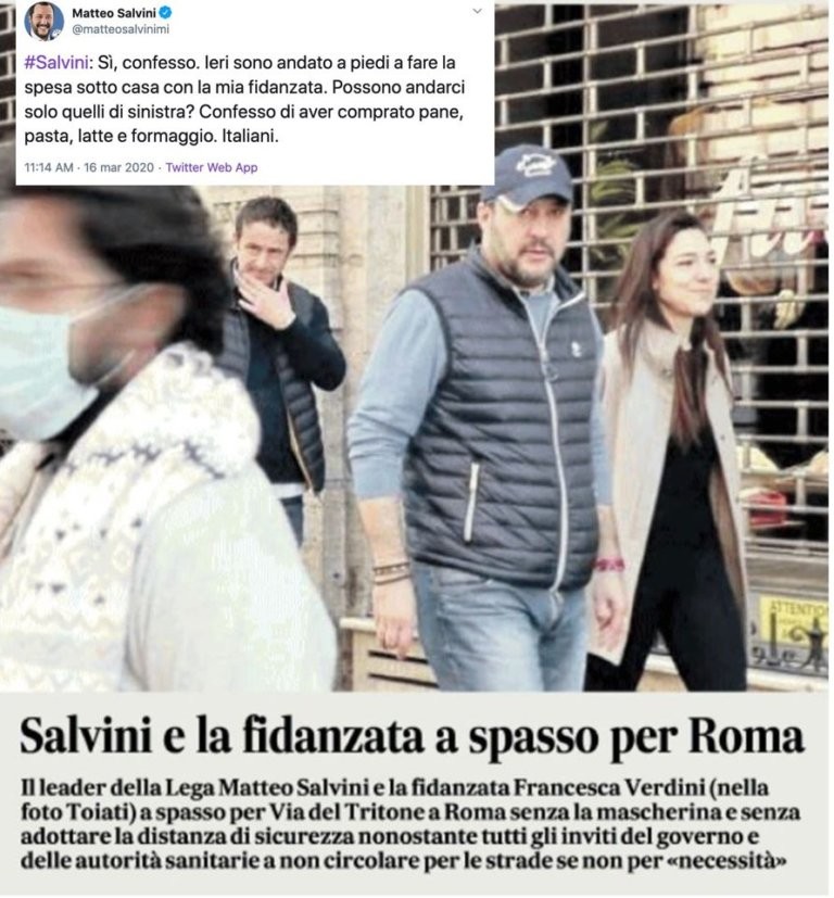 È con i suoi soliti toni da bulletto che Matteo Salvini ha reagito alle fotografie de Il Messaggero che lo hanno ritratto mentre violava i decreti per il contrasto al Coronavirus. Tirando in ballo imprecisati «quelli di sinistra» come se l'insulto gratuito fosse la sua soluzione a tutto, dice che lui stava andando a fare la spesa. Sì, senza borse, senza sacchetti e ab avvinghiato alla sua nuova fidanzatina notante i decreti stabiliscano che si può andare unicamente da soli e non certo senza mascherine, senza protezioni e con una ragazzetta a meno di un metro di distanza. Evidentemente, come suo solito, lui se ne frega e pensa che le limitazioni che stanno subendo gli italiani non debbano riguardare i membri della ricca élite padana: