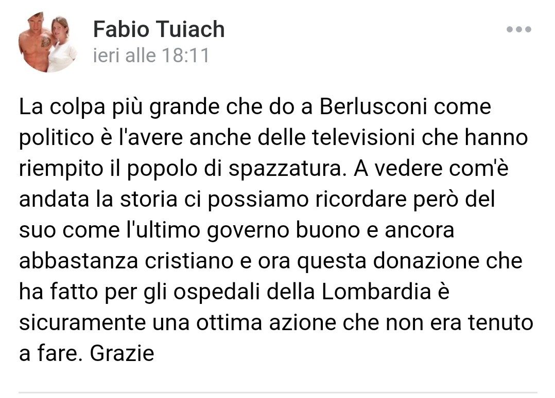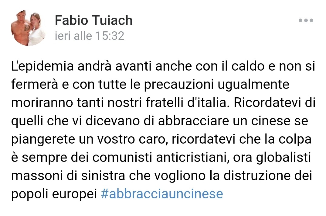 I suoi deliri social proseguono poi con il suo sostenere che sia colpa dell'antifascismo se i cinesi sani che vivono in Italia non sono stati odiati come lui avrebbe voluto, sostenendo che lui ha deciso che in molti moriranno per colpa del Coronavirus (anche se a contagiarli non sarà un cinese ma un consigliere comunale che si vanta di violare i decreti per il contenimento solo perché lui sente il bisogno di andare nelle chiese ad idolatrare degli oggetti). Arrivando a sostenere che quello Berlusconi sia stato l'ultimo "governo cristiano" conforme alla sua idea di "cristianesimo", è tra insulti, offese e bullismo che il signor Tuiach scrive:
