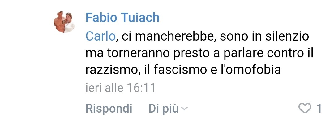 Non sappiamo perché il consigliere voglia che i suoi figli sappiano che mamma viene scopata unicamente nella posizione del missionario, ma sappiamo che un esponente delle istituzioni che usa la parola «fr*ci» è una vergogna anche per quel prefetto di Trieste che non interviene nel sollevare dal suo incarico un violento che si fa promotore del nazifascismo mentre calpesta e insulta la nostra Costituzione.