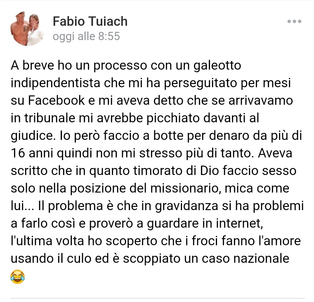 Il consigliere Fabio Tuiach ama vantarsi pubblicamente di come lui cerci di far soldi denunciando chiunque risponda stizzito alle sue costanti provocazioni e insulti. Diffamando l'imputato e mostrando come lui abbia tutta l'intenzione di perseguitare, insultare, offendere e denigrare quei cittadini gay da cui poi pretende di farsi pagare lo stipendio pubblico che gli è stato regalato dalla Lega di Matteo Salvini, è dal suo profilo Vk che scrive: