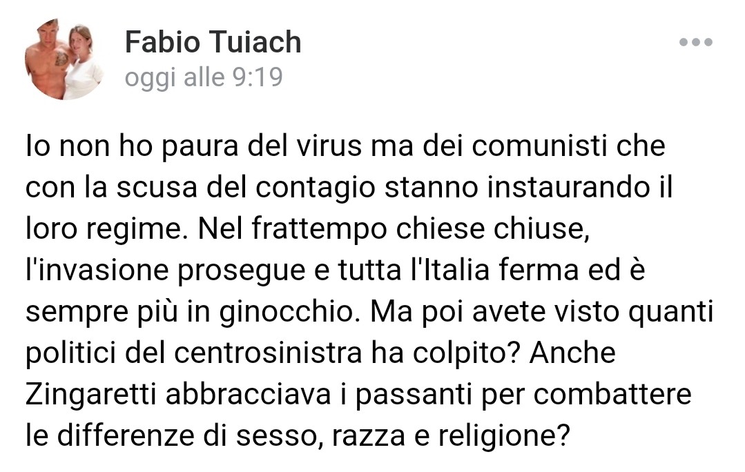 Se vi domandaste che cosa dovrebbe mai c'entrare il comunismo, è perché il consigliere Tuiach va in giro da giorni a bestemmiare Dio e a sostenere che il virus sarebbe un atto divino finalizzato ad uccidere i cinesi e chiunque non sia fascista quanto lo è lui: