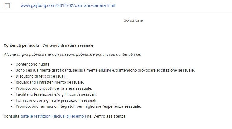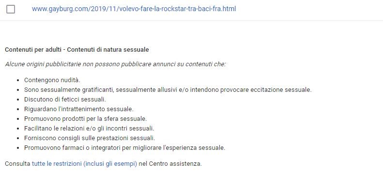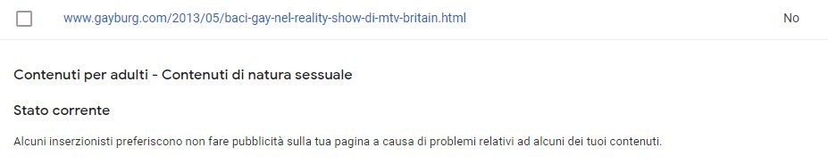 Nella notifica di esclusione di quella pagina dal loro network, Google la etichetta in questa categoria:
