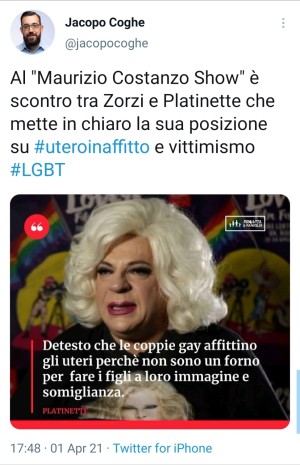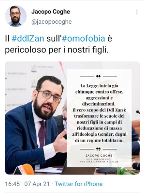 L'organizzazione forzanovista di Jacopo Coghe cercò di andare nelle scuole ad indottrinare i bambini al sesso bareback attraverso un insensato "corso di educazione sessuale biblica" che fu predisposto da Maria Rachele Ruiu al fine di invitare i minorenni a fare sesso non protetto. Ora dice che i bambini sarebbero in «pericolo» perché c'è il rischio che non diventino omofobi quanto lui o che si sentono protetti dalle aggressioni neofasciste se saranno gay. Ed evidentemente per lui tutto ciò è insopportabile.