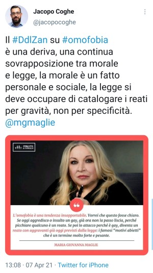 Praticamente dicendo cose a caso pur di spaventare gli omofobi, scrive che: «La legge tutela già chiunque contro le offese, aggressioni e discriminazioni. Il vero scopo del ddl Zan è trasformare le scuole dei nostri figli un campi di rieducazione di massa all'ideologia Gender, degna di un regime totalitario».