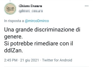 Ovviamente il ddl Zan non parla delle fantasie sessuali dei parroci sovranisti nei confronti dei costumi da bagno, ma si sa anche che questa gente ama scrivere cose a caso pur di irridere i bambini e le vittime di discriminazione. Ma dato che don Bianchi non dice nulla che non sia allineato alla propaganda dei gruppi neofascisti, c'è da temere che quel messaggino possa essere la sua reinterpretazione degli sproloqui transofobici di Pillon e del suo amichetto Coghe. Magari voleva irridere le donne trans, rilanciando il suo sostenere che non bisogna accettare la loro esistenza. E chissà se poi proporrà pure raid neofascisti nelle spiagge di Gatteo a Mare per verificare i genitali delle bagnanti.