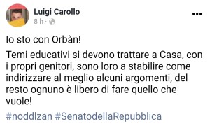 Il pastore Luigi Carollo, portato alla ribalta dei programmi populisti di Rete 4 grazie all'endorsement fornitagli dell'organizzazione forzanovista Provita Onlus, dice di stare con Orban. Dice che la sessualità è un tema che lui vuole sia affrontato esclusivamente dai genitori e quindi plaude ad una legge che vieta ogni rappresentazione pubblica di qualunque orientamento sessuale non sia la sua, quasi esistesse un nesso tra le due cose.