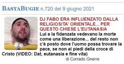 Vi ricordate il caso del DJ Fabo? Colui che decise di andare a morire in una clinica svizzera perché rimasto immobilizzato in conseguenza di un incidente stradale. Ebbene, la sua fidanzata, Valeria Imbroglio, comunicò, nei giorni in cui tutt'Italia discuteva sulla scelta del giovane, il suo legame con la religiosità orientale e anche con certe correnti esoteriche. D'altronde i due giovani, prima dell'incidente, avevano per ben cinque anni vissuto in India alla sequela di un santone del posto.