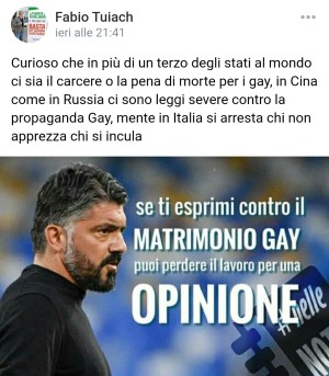 Tuiach elogia Gattuso: «Alcuni uccidono i gay mente in Italia si arresta chi non apprezza chi si incula»