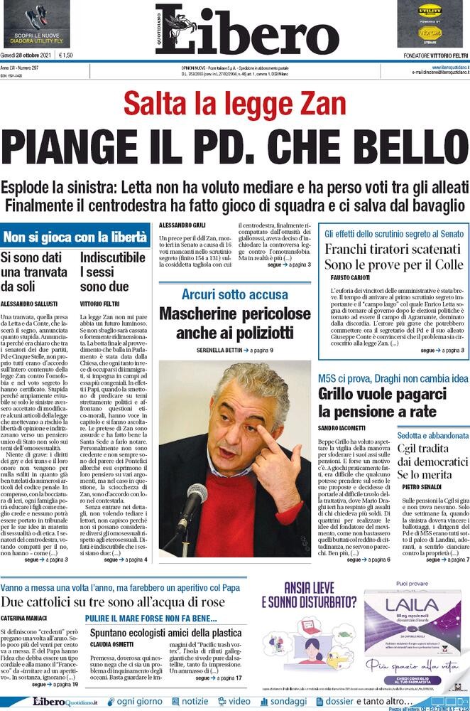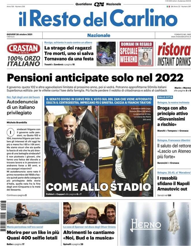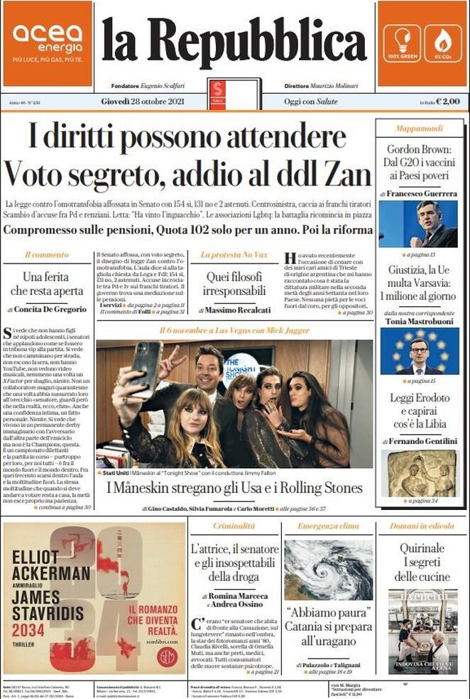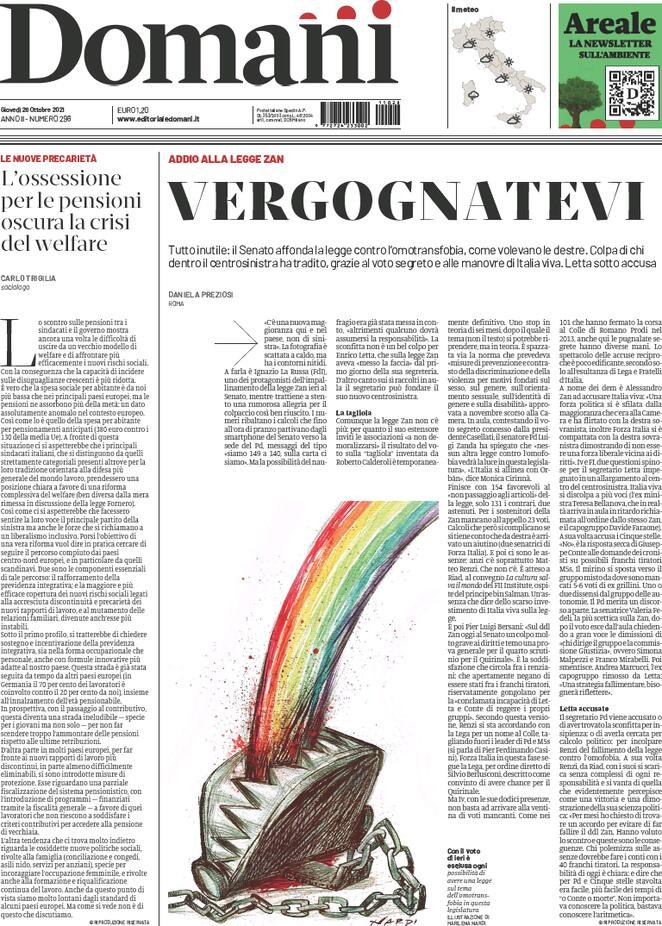 Oggi quasi tutti i quotidiano hanno dedicato spazio ai franchi tiratori che hanno ucciso la legge contro l'omotransfobia, la misoginia e l'abilismo. La Repubblica titola "I Diritti possono attendere. Voto segreto, addio al DDL Zan" mentre Il Corriere scegli un più coinciso "Omofobia, affossata la legge" mentre Il Manifesto cita un capolavoro di Mike Leigh del 1995 titolando “Segreti e Bugie”. Il Il Fatto Quotidiano ha scelto un “Affossato il DDL Zan, fondata la maggioranza di destra-Iv” mentre La Stampa parla di “Parlamento dei diritti negati”. Il Resto del Carlino sottolinea gli indecenti applausi tra i banchi delle destre: “Come allo Stadio, senato diviso in curve”. Domani ha optato per un semplice: “Vergognatevi”