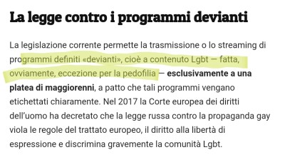 Se è pur vero che le virgolette tentano di attribuire ai russi la definizione di «devianti», quel «cioè» pare dare valore al loro sostenere che le trasmissioni «a contenuto lgbt» dovrebbero essere ritenuti tali. Ma, soprattutto, lasci basiti vedere come la signora tenti di far rientrare nella definizione di «lgbt» anche la «pedofilia» dato che dice che vadano esclusi dall'insieme.