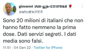 I no-vax sono davvero incredibili, proponendosi come quelli che credono a qualunque cosa rinneghi l'ovvio. Ed è così che se il signor Giovanni va da loro a dire che lui sarebbe entrato in possesso dei dati segreti dei servizi segreti, c'è chi gli crede e rilancia quel tweet pensando sia un dato di fatto: