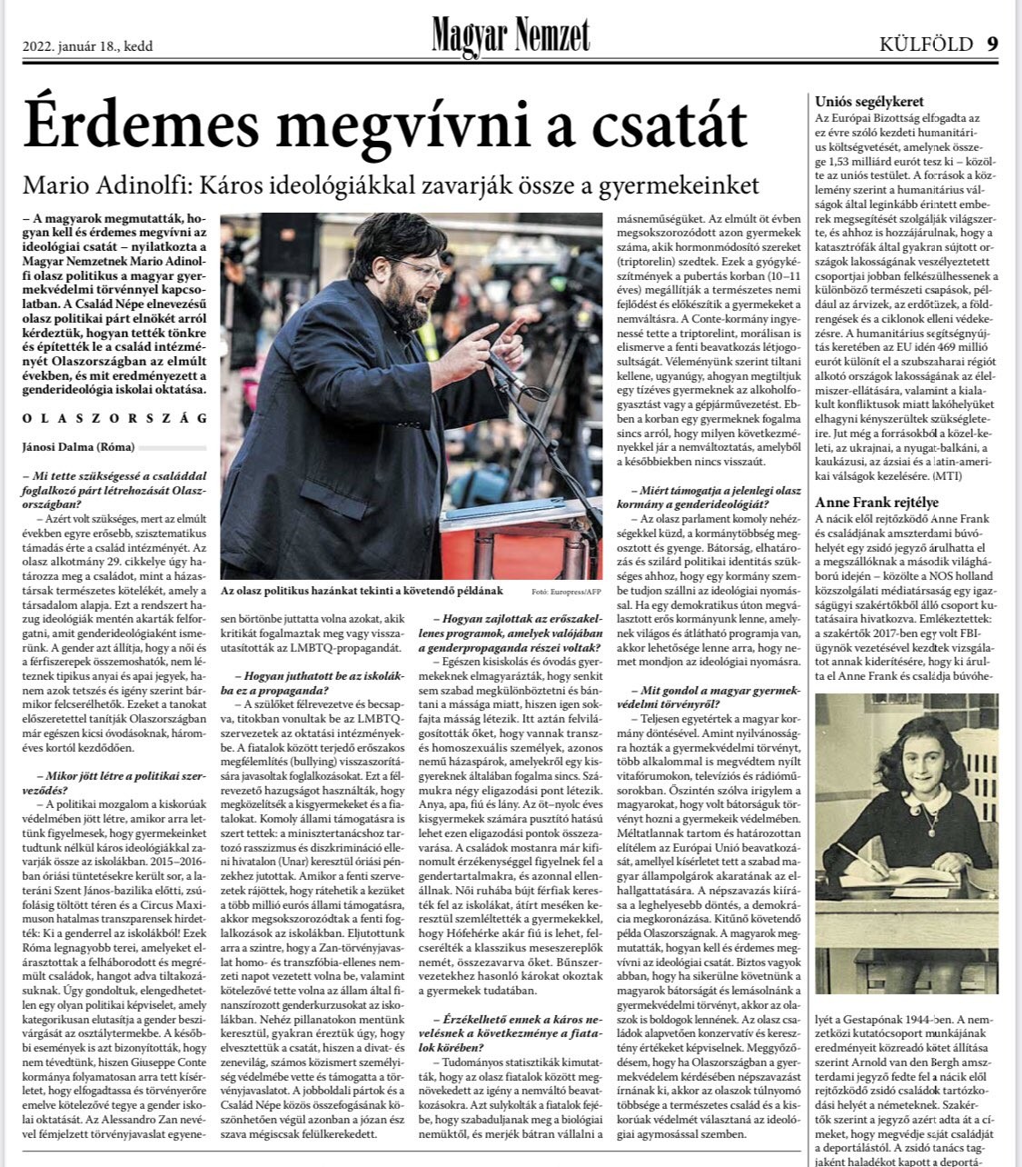 "Gli ungheresi hanno mostrato come la battaglia ideologica deve e deve essere combattuta", ha detto il politico italiano Mario Adinolfi alla nazione ungherese in merito alla legge ungherese sulla protezione dei bambini. Abbiamo chiesto al presidente di un partito politico italiano chiamato Popolo della Famiglia come l'istituto della famiglia in Italia è stato distrutto e demolito negli ultimi anni e quali sono i risultati dell'educazione di genere nell'istruzione scolastica.