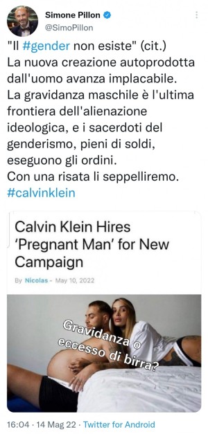 Il senatore leghista Simone Pillon si è molto arrabbiato per la pubblicità di Calvin Klein che mostra un uomo transgender in dolce attesa. Promettendo che lui «seppellirà» chi non è omofobo quanto i suoi finanziatori russi o l'amico ungherese, il leghista si lancia nel sostenere che si debba essere «pieni di soldi» per rimanere incinti. Evidentemente ignora che è sufficiente non usare il preservativo. O magari pensa che il suo elettorato sia così ignorate da non aver ritenuto necessario aggiornare gli slogan che è solito urlare contro la GpA.