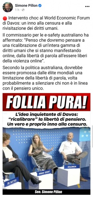 Secondo il senatore leghista Simone Pillon, sarebbe «una follia» persare che la libertà di parola non sia assoluta e che non possa degenerare in minacce, molestie, diffusione di notizie false e odio. Forse ignaro che in Italia la legge già prevede limiti alla libertà di parola dato che reati come la diffamazione hanno rilevanza penale (cosa che non accade negli States), il leghista scrive: