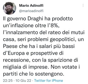 Pare anche che Adinolfi non abbia capito chr problemi geopolitici li abbia creati il suo amato Putin, non Palazzo Chigi. La crescita dell’inflazione e le conseguenze che ne derivano sono un problema continentale e i salari italiani non crescono da trent’anni. Quindi lui potrà anche odiare Draghi, ma dovrebbe avere l'onestà intellettuale di non incomparlo se fuori piove.