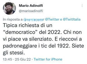 Quindi l’istigazione all'odio sarebbe "libertà di espressione" e il diritto di critica sarebbe fascismo contro chi vuole usare la forza per obbligare le donne a fare ciò che lui ordina loro. Adinolfi ne è proprio certo? E davvero dichiara di essere stato preso a manganellate e costretto a bere olio di ricino, senza poter usufruire del gabinetto, da rappresentanti LGBT o persone favorevoli ad diritto di scelta delle donne? Perché è questo che le camicie nere facevano agli oppositori. E se a lui non è capitato nulla di questo, saremmo davanti quello che parrebbe un reato penale di calunnia.