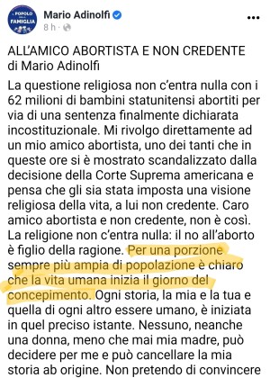 Mario Adinolfi sostiene che non possa essere ritenuto «credente» chi non ritiene che le donne vadano costrette con la forza a partorire contro la loro volontà, evidentemente ritenendo che solo i no-vax abbiano il diritto di scegliere sui loro corpi. Ed è per attribuirsi un consenso mai ottenuto alle urne che il fondamentalista si inventa che «per una porzione sempre più ampia di popolazione è chiaro che la vita umana inizia il giorno del concepimento». Lo dichiara su Facebook: