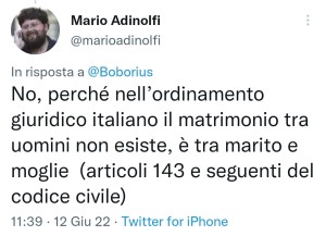Potremmo ritenere che Adinolfi non condivida le nostre leggi, ma sarebbe molto ipocrita il suo contestare le leggi dello stato dopo che per settimane ha sostenuto che il Codice Civile dovrebbe invalidare il sentimento popolare che non ritiene che il suo essere eterosessuale dovrebbe conferire più valore ai suoi due matrimoni rispetto a quelli contratto tra due uomini: