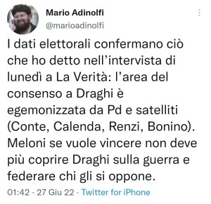 Intanto Mario Adinolfi, forte dei suoi zero voti conquistati a Ventotene, vuole dare consigli alla Meloni su come vincere le elezioni. Ed ovviamente le chiede di federare il suo partito, sostenendo che la politiva si faccia contro qualcuno e mai per costruire qualcosa: