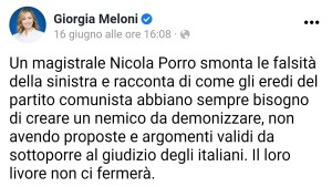 La signora dell'ultra-destra si autoproclama vittima di odio perché qualcuno osa esercitare un lecito diritto di critica nei suoi confronti, attribuendo al solito Nicola Porro lapaternità di quella surreale teoria.