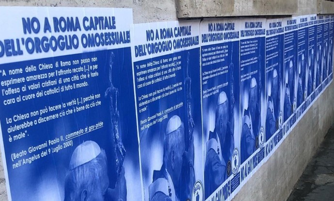 Alla vigilia del Roma Pride, i soliti gruppi neofascisti hanno voluto ostentare tutto il loro degrado morale e la loro irrisione della religione cattolica. Lungo il percorso del corteo, hanno affisso manifesti abusivi a firma di Militia Christi e Rete dei patrioti con scritto "No a Roma capitale dell’orgoglio omosessuale".
