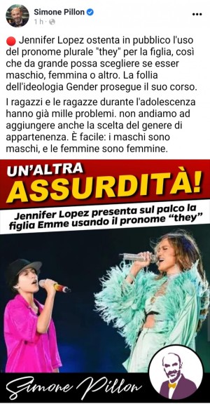 Il senatore leghista Simone Pillon ha diffamato Jennifer Lopez, accusandola di essere una cattiva madre in quanto rispettosa dell'identità di genere dei figli. Urlando che il regime leghista vieterà l'esistenza alle persone transgender, esattamente come tentò di fare anche Hitler, l'esponente leghista chiarisce che lui vuole che ai bambini sia imposto il sesso biologico: