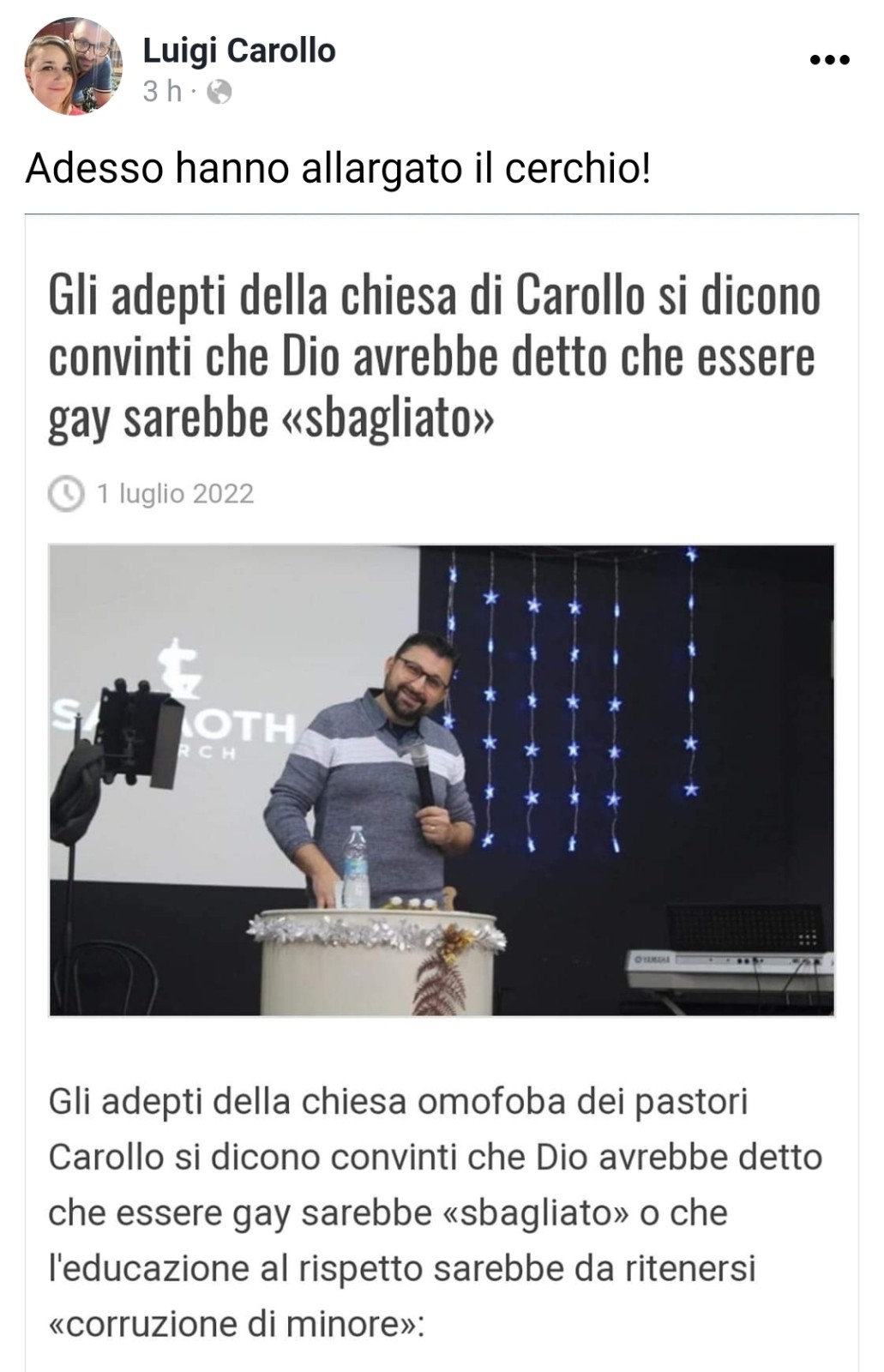 Il pastore Luigi Carollo appare abbastanza surreale. Mentre dal pulpito sostiene che una legge contro i reati d'odio e l'istigazione alla discriminazione sarebbe "liberticida" nei confronti degli omofobi, minaccia di sporgere denuncia contro chiunque osi dissentire da lui.
