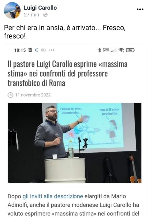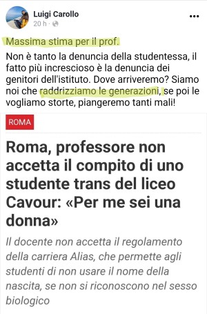 Dopo gli inviti alla descrizione elargiti da Mario Adinolfi, anche il pastore modenese Luigi Carollo ha voluto esprimere «massima stima» nei confronti del professore transfobico che a Roma si è si è rifiutato di accettare il compito in classe consegnato uno studente transessuale che aveva ottenuto l'accesso alla cosiddetta "carriera alias", una procedura formale che gli avrebbe dovuto permettere di poter usare il nome di elezione al posto di quello anagrafico.