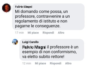 Sostenuto che le persone transessuali sarebbero «persone storte» che meriterebbero di subire umiliazioni violenze all'interno dell'ambiente scolastico, è tra i commenti che il pastore modenese tenta di sostenere che la violazione delle leggi sarebbe un atto di eroico «non conformismo». Dice anche che lui vorrebbe che il professore omofobo sia nominato «rettore» del liceo Cavour di Roma, forse ignorando che nelle scuole superiori ci sono i presidi e non i rettori: