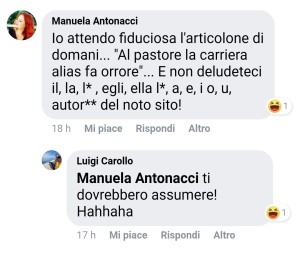 Dato che il pastore Carollo si dichiara vittima di chi osa contestare il suo pensiero unico ed ama aizzare i suoi proseliti a fare branco contro chi non pensa che l'omofobia sia cosa buona e giusta, sulla sua pagina si palesa Manuela Antonucci di Provita Onlus. Creatrice della bufala di Bibbiano e promotroce di innumerevoli battaglie contro i diritti delle persone lgbt, pare voler sfottere Gayburg nello scrivere: