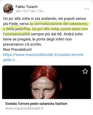 Sempre urlando che lui vorrebbe criminalizzare l'omosessualità, è citando Blondet che il camerata triestino si inventa che qualcuno vorrebbe "normalizzare la pedofilia" perché loro vedrebbero "satanismo" nelle sfilate di moda: