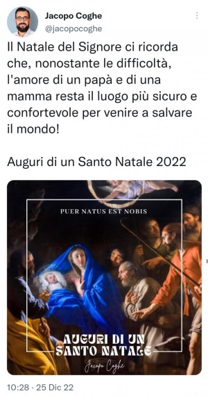 Dato che Jacopo Coghe e la sua organizzazione forzanovista Provita Onlus risultano strenuamente impegnati nel coltivare odio contro tutte quelle famiglie che non prevedono una Meloni che concepisce figli al di fuori del matrimonio o un Salcini che molla le fidanzatine già ingravidare per correre dietro alle ragazzine, appare alquanto ipocrita il messaggio da lui diffuso in occasione del Natale: