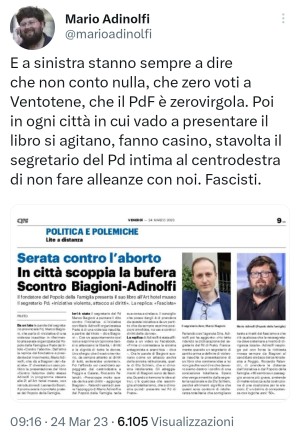 Da sempre avvezzo agli insulti, Adinolfi dice che sarebbe «fascista» chi contesta il suo chiedere leggi che impongano le sue idee agli altri. O non conosce il significato di quel termine o è davvero in malafede.