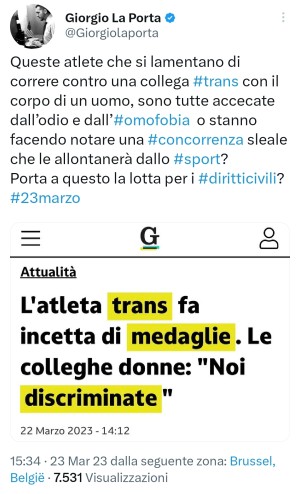 Se il suo tirare in ballo i diritti civili per cercare di convincere i leghisti che la mancata discriminazione poterebbe alla discriminazione del maschio eterosessuale bianco si commenta da sé, non stupisce che La Porta non abbia fatto presente che a lamentarsi per la mancata discriminazione dell'atleta sia stato il blog di Marina Terragni, noto personaggio anti-trans che venne persino invitata in audizione da Simone Pillon a dar man forte alle organizzazioni forzanoviste contro il ddl Zan: