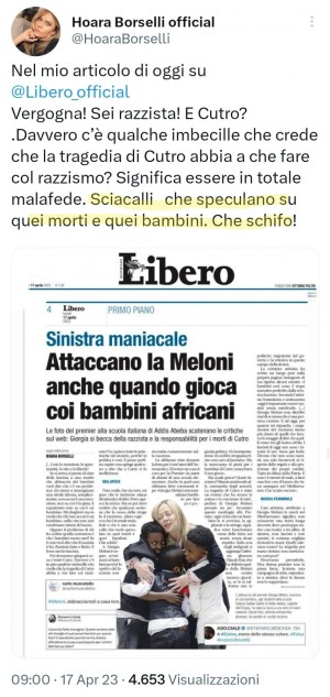 Interessante è come la signora Borselli sostenga che quella fotografia propagandistica mostrerebbe la signora Giorgia che "gioca con i bambini africani", parlando di "spontaneità" del gesto e di "madre che abbraccia die bambini" in quella loro corsa a semplificare ogni tema, quasi ritenessero che ai loro elettori si debba parlare come se fossero bambini poco intelligenti.
