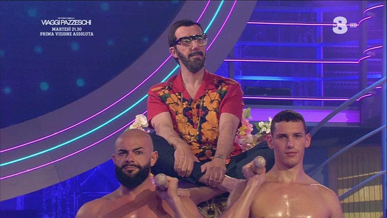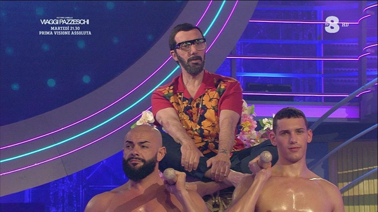 È Ubaldo Pantani ad aver imitato Costantino della Gherardesca a Gialappa Show. Per il suo ingresso ha deciso di farsi portare sul palco, con una certa discrezione, da quattro palestrati che difficilmente passano inosservati.