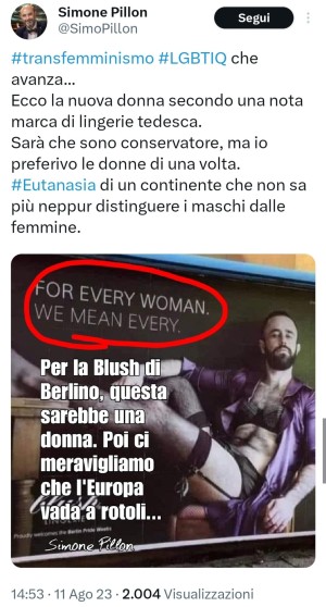 Finito di insultare la Murgia, il leghista Simone Pillon è già ripartito con la sua solfa sul fantomatico "gender" che oscurerebbe il suo dirsi esempio di virilità padana. Ed è dimostrando di non capire nulla di marketing che il leghista urla che a lui non sta bene la pubblicità scelta da un'azienda di intimo e incolpa l'Europa di non essere come quella Russia che tanto piace alle lobby di estrema destra: